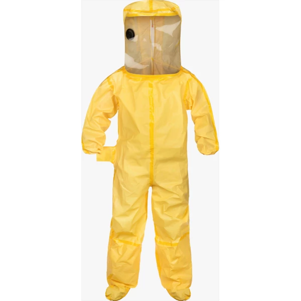 ChemMax 1 encapsulating suit with PVC visor & attached boots with boot overflap. Flat back with air inlet hose.
