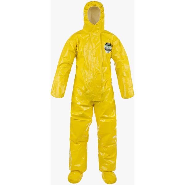 Chemical protective coverall with elastic hood and waist, double cuffs and attached socks with boot overflap, double zip & storm flap, and supported by Permasure®. Stitched and taped, sealed seams.. EN Type 3 liquid jet spray and Type 4 liquid spray chemical protection. ChemMax® 4 Plus fabric is tough and durable, using multi-layer high chemical barrier polymer films. It provides permeation resistance against challenging chemicals such as Bromine (EN Class 2), Diethylamine (EN Class 6) and Tetrahydarfuran (Class 6), and with over 80 chemicals permeation resistance tested. CheMax® 4 Plus also works with Permasure®, Lakeland's easy-to-use smart-phone app that calculates safe-wear times for over 4000 chemicals, accounting for the effect of temperature on permeation rate and chemical toxicity. The fabric co-extrusion production process results in a low noise, flexible and smooth finish that is more fabric-like and has no bonding dimples where a chemical might cling as commonly seen in many chemical suit fabrics. Infectious Agent Barrier – passes all four EN 14126 bio-hazard tests at the highest classes. Tested for resistance against seven key chemical warfare agents so suitable for military, anti-terrorist and civil defense applications. Certified to EN 1149-5 for static dissipative clothing.